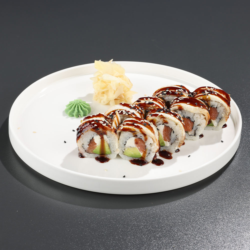 orez, somon, țipar, cremă de brânză, avocado, alge nori, susan, sos unagi 300 g