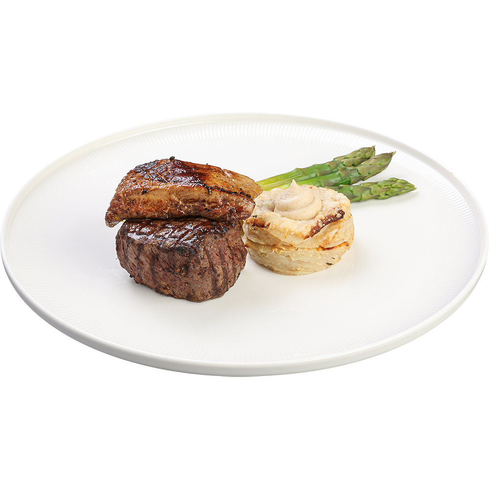 mușchi de vită, ficat de rață, țelină, sparanghel, sos Cabernet 470 g
