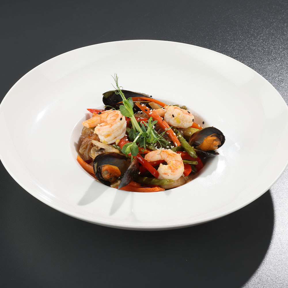 creveți, midii, calamari, tăiței de orez, legume, ceapă verde, sos thai 360 g