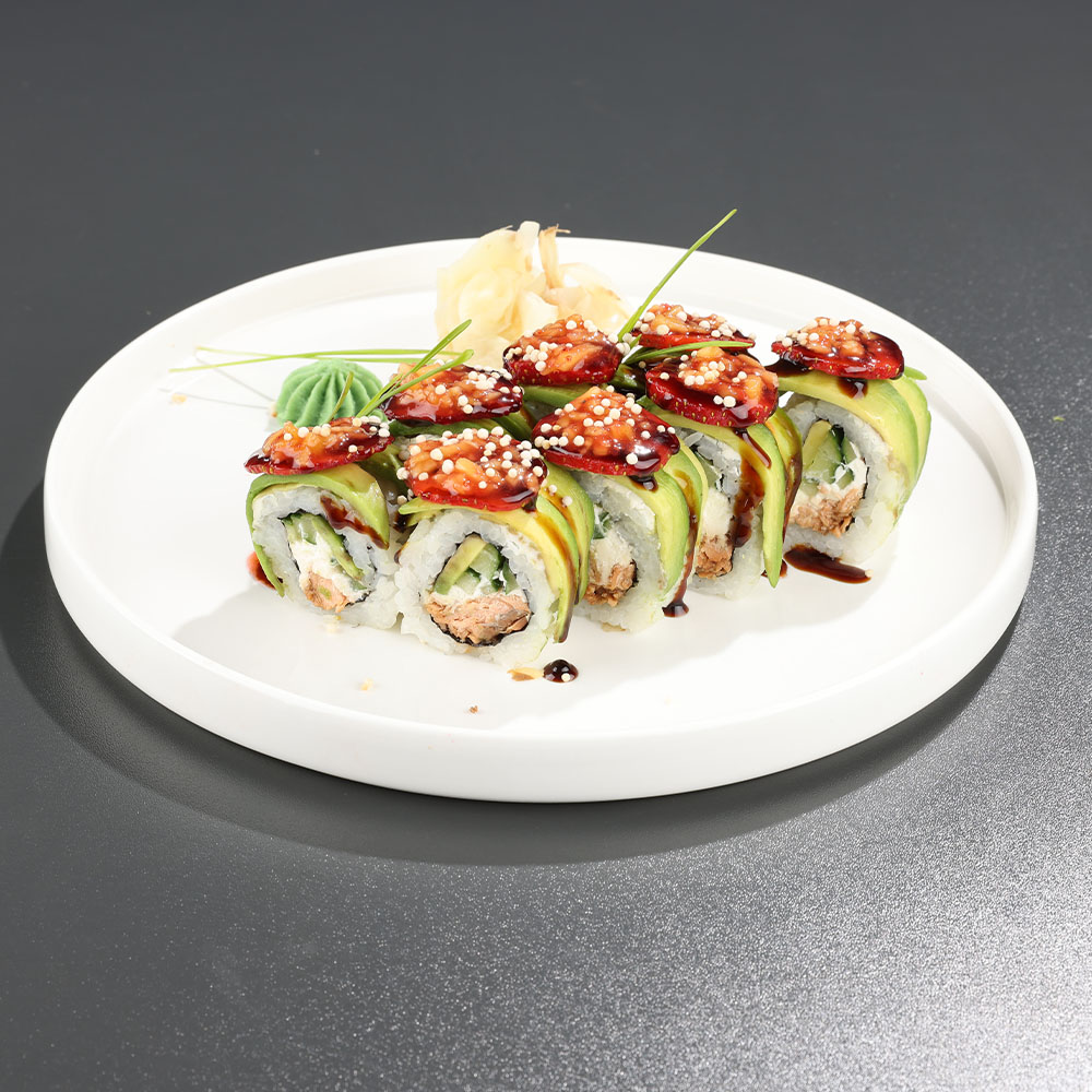 orez, somon, cremă de brânză, avocado, castraveți, alge nori, masago arare, mango, căpșună, sos unagi 320 g