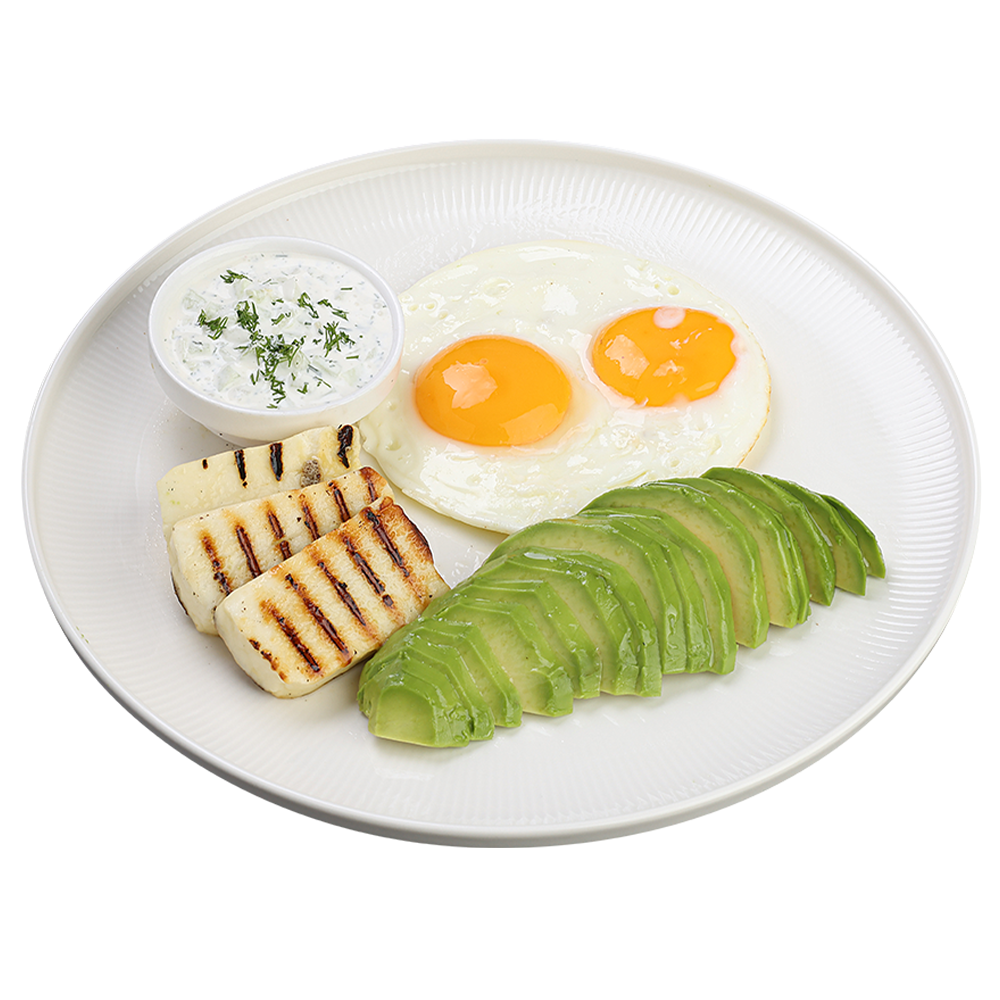 brânză Halloumi, ouă, avocado, sos tzatziki, roșii cherry, castraveți 390 g