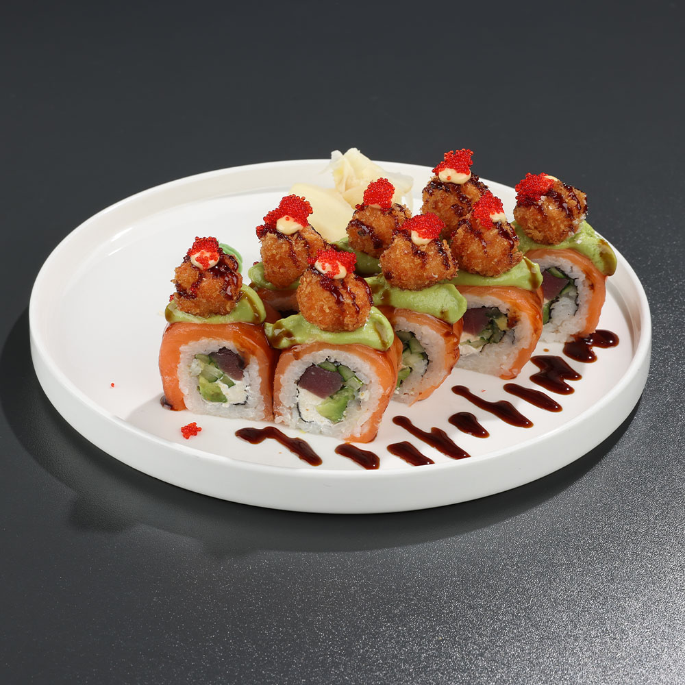 orez, somon, creveți, ton, cremă de brânză, maioneză japoneză, avocado, castraveți, alge nori, tobiko, sos unagi 360 g