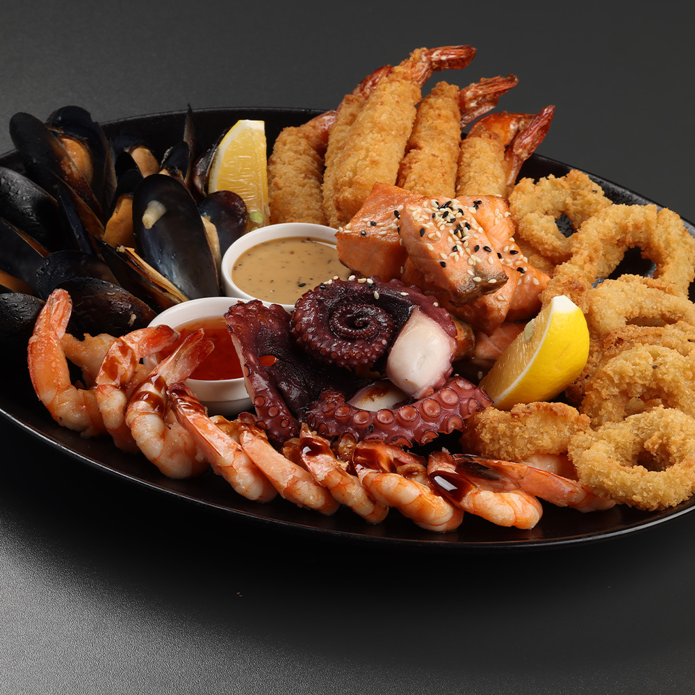 creveți, midii, inele de calamar, somon, caracatiță, sos sweet chilli, sos de nuci 1100 g