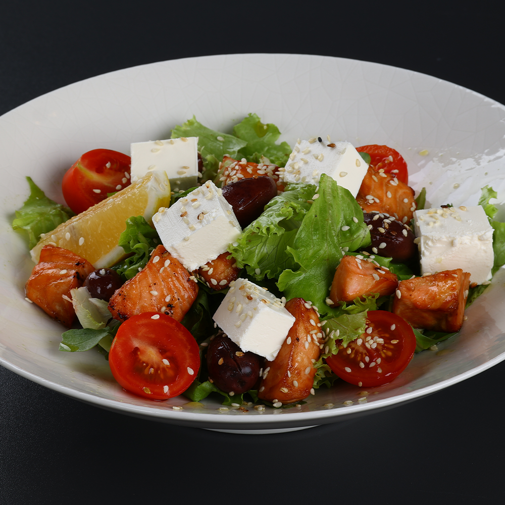somon, brânză feta, roșii cherry, kalamata, salată mix, semințe de susan 290 g