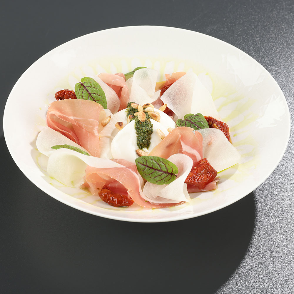 burrata, prosciutto, pepene galben, sos pesto 330 g