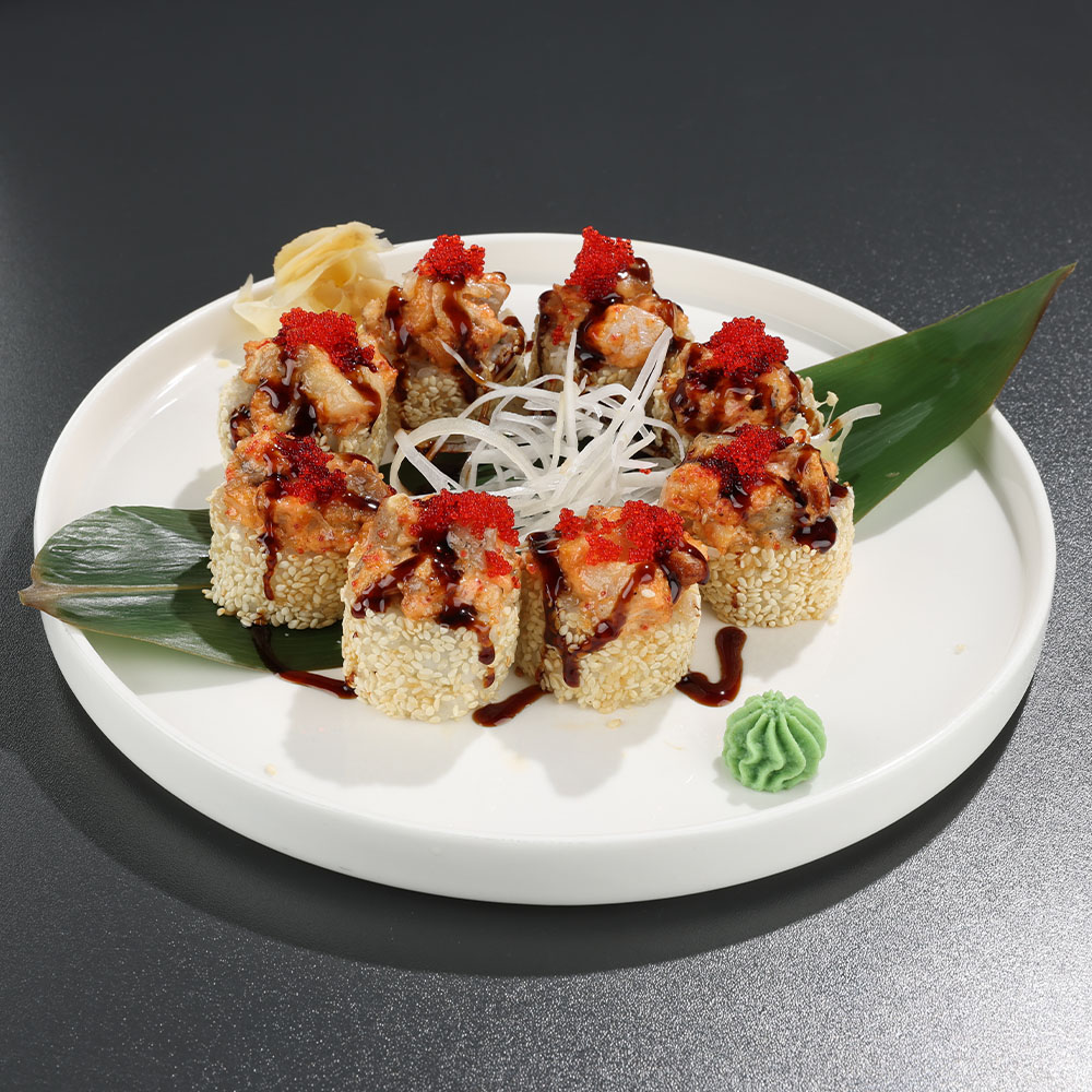 orez, ton, cremă de brânză, parmigiano, avocado, castraveți, alge nori, tobiko, susan, sos spicy 300 g