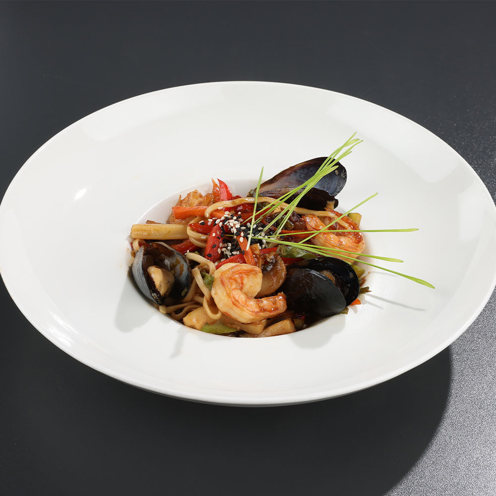 creveți, midii, calamari, tăiței de grâu, legume, ceapă verde, sos thai 350 g